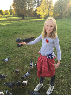 Here's brave Esme being the bird girl of Kensington Gardens (BLEURGH! RATTY PIGEONS!).