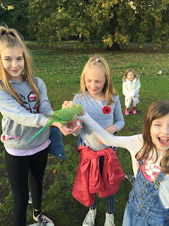 Fast forward 29 years, (yep, big birthday coming up next March) and I have discovered that parakeets in Kensington Gardens will eat sunflower seeds out of your hands if you stand still long enough with your arm outstretched. You do have to kick away the ferreting pigeons around your feet, scrounging for any dropped seeds but it's pretty cool to have a bright green bird perched on your hand (whilst tourists take your picture and you try to look serene and unafraid of anything, not least those bloody pigeons at your ankles). The girls have enjoyed this park activity with mixed success over the last 6 months or so (usually one child will "get" a bird and the other will come bowling over loudly screeching that it's not FAIR and can they give it to them now?) and with it being half term this week, requested that we go back with the remnants of the seeds from the cupboard. We did this yesterday, complete with Alyssa and visiting friends Emma, Esme and Baxter, their dog.