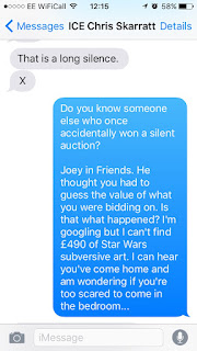 "One slight "hiccup" - I bid on some art in a silent auction for the children's air ambulance charity - and inadvertently won £490 worth of unique, subversive Star Wars art. It's not quite a bus fine, I'll give you that, but it is for a very good cause. I'm hoping the door will be open when I get home?!"